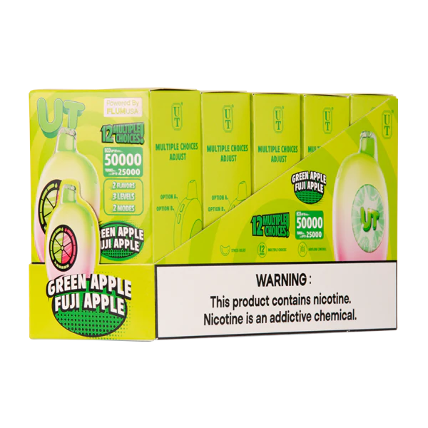 - Flavor: A double flavor combo of pure vaping enjoyment is on tap with the Green Apple/Fuji Apple UT 50K disposable vape. Blend the flavors or enjoy them on their own. Crank up the power for more satisfaction or more puffs with eco mode. There is even a squeezable center section for the fidgety adult vapor consumer.